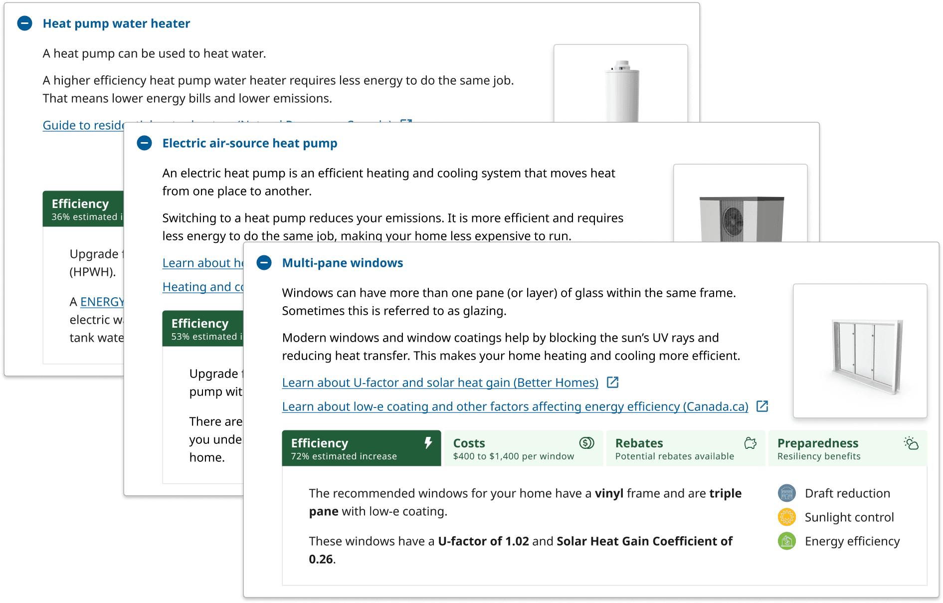 Home improvements and maintenance, big or small, can help protect homeowners from extreme weather events and hazards. An extra tab was added within each energy upgrade card component to show how each upgrade can help.
