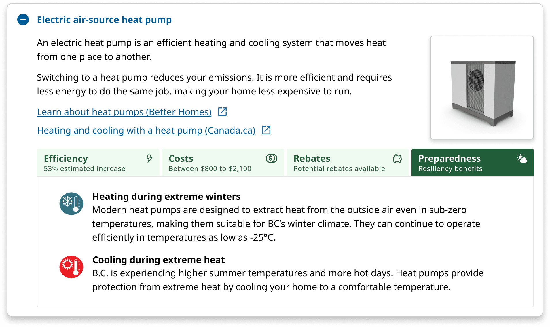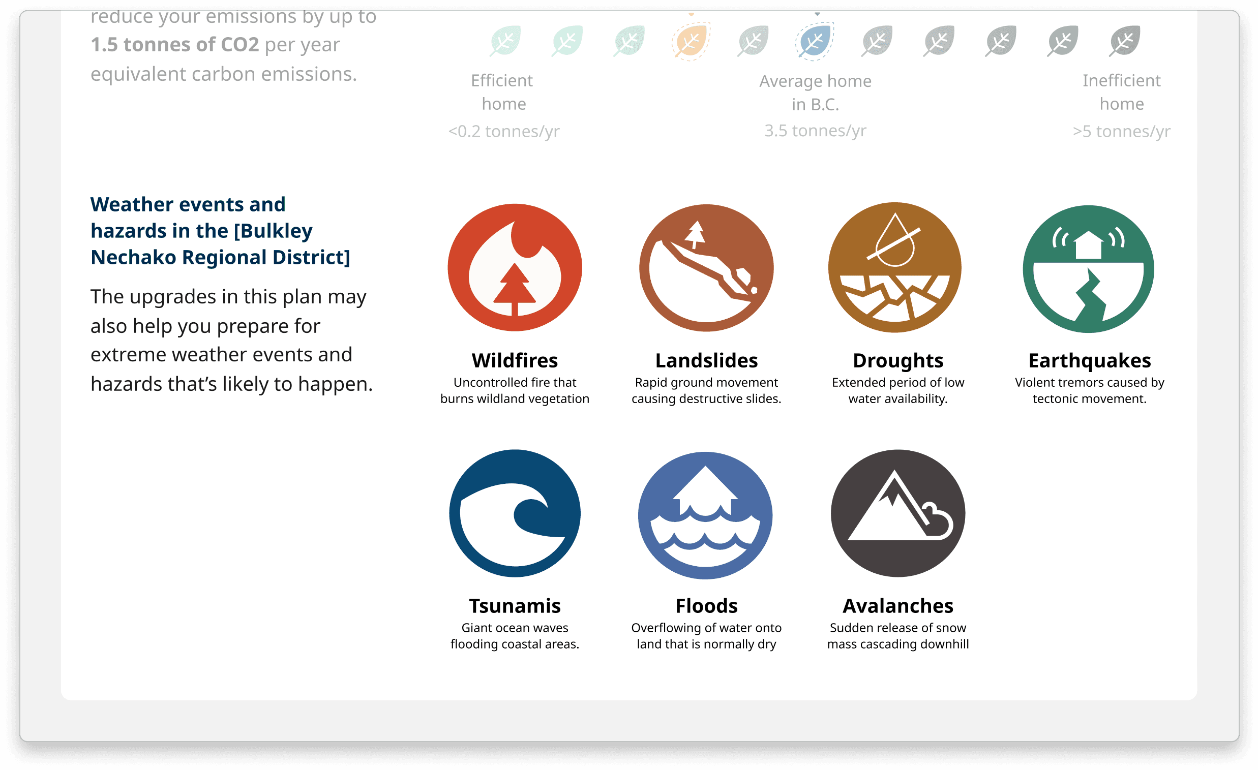 Shortly after the release of the pilot program, EMCR approached us to integrate content from PreparedBC into the planner by highlighting how certain home energy upgrades can help homeowners prepare for extreme weather events near the homeowners area, and serve as an intuitive entry point to other climate readiness resources provided by EMCR.