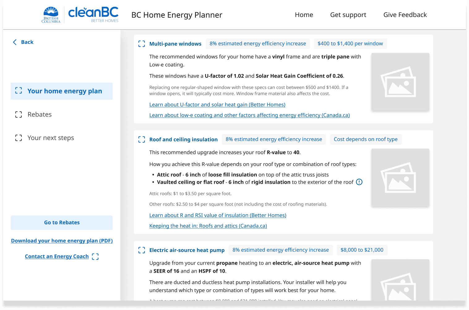 A unique home energy upgrade plan is generated tailored to each home and homeowner. The plan first provides insight to homeowners on the current state of their home, and then recommends retrofit upgrades that can help.